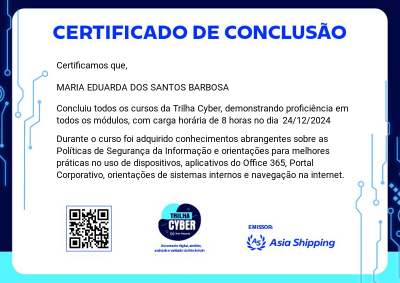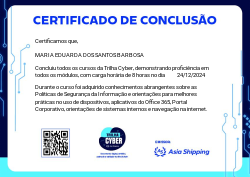 A Trilha Cyber é um dos badges do programa de certificação da Asia Shipping. Ela aborda as melhores práticas de uso dos sistemas internos e do e-mail corporativo, reforçando a segurança e a eficiência no ambiente digital.