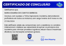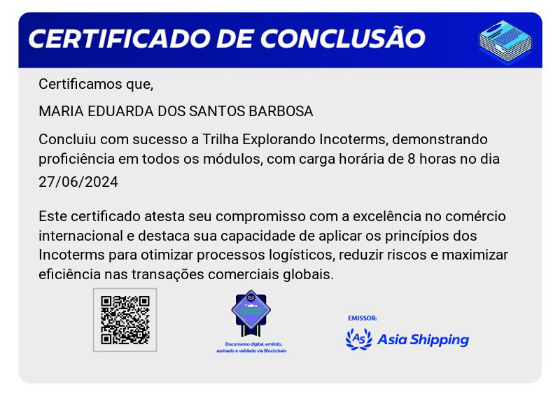 A Trilha Explorando Incoterms inclui elementos relacionados ao comércio internacional, como ícones representando diferentes termos de Incoterms, símbolos de negócios globais ou elementos que destacam a importância do entendimento dos Incoterms para profissionais envolvidos em transações comerciais internacionais. Essa badge serve como um símbolo de conquista e conhecimento na área de comércio internacional e logística.