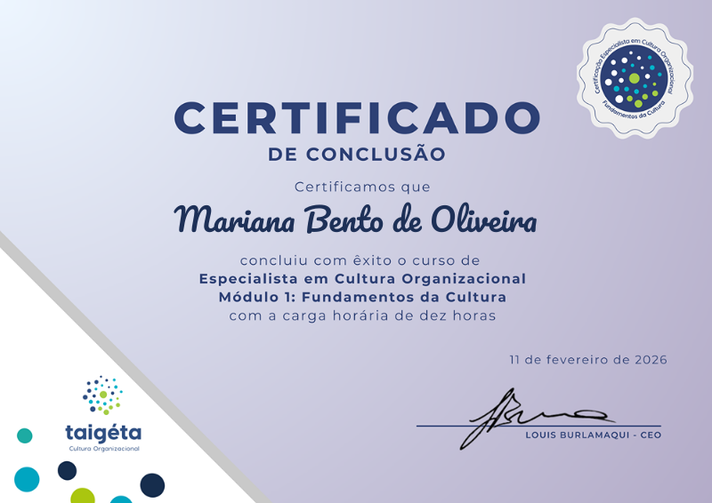 Para ganhar esta medalha e certificado, o aluno concluiu a carga horária do módulo 1 Fundamentos da Cultura Organizacional e entregou seu trabalho de conclusão de módulo com nota satisfatória.