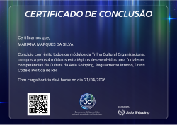 Esta badge digital certifica a conclusão da Trilha Cultura Organizacional na Asia Shipping. O detentor demonstra domínio completo dos conceitos de Cultura Organizacional, Regulamento Interno, Dress Code e Políticas de RH.