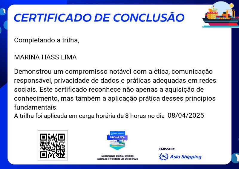 Nessa trilha combinamos temas representativos de Código de Ética, Política de Comunicação Eletrônica Corporativa, Política de Privacidade e Proteção de Dados Pessoais, Guia de Boas Práticas em Redes Sociais e LinkedIn. Esta badge certifica o conhecimento e a conformidade nas práticas essenciais para ética, comunicação corporativa responsável, privacidade de dados e uso adequado das redes sociais.