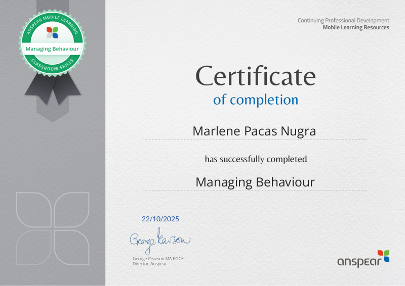 Awarded for completing the Managing Behaviour CPD course from Anspear.