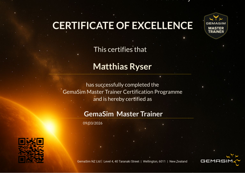 The GemaSim Master Trainer credential recognises experienced GemaSim practitioners who are authorised to train and certify GemaSim Certified Trainers.