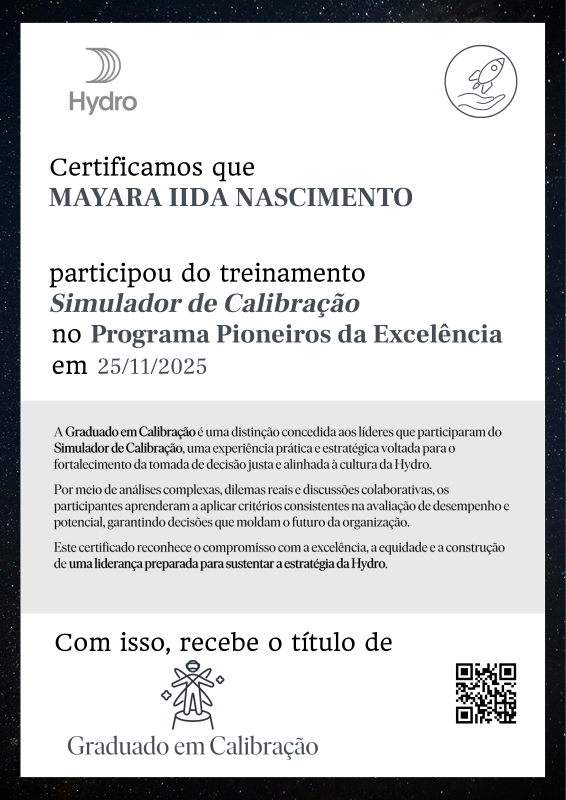 A Graduado em Calibração é uma distinção concedida aos líderes que participaram do Simulador de Calibração, uma experiência prática e estratégica voltada para o fortalecimento da tomada de decisão justa e alinhada à cultura da Hydro.