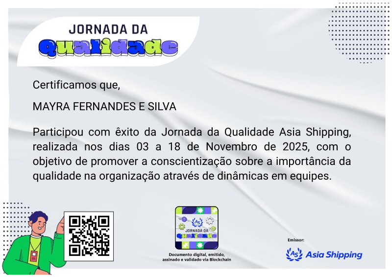 Para receber a Badge Comemorativa da Jornada da Qualidade Asia Shipping, é necessário ter participado das atividades realizadas durante o evento.
