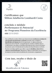 Esta badge reconhece líderes que demonstraram excelência na condução do ciclo de gestão de performance e potencial, atuando como verdadeiros identificadores de talentos dentro da organização. Ao aplicar práticas de definição de metas SMART, acompanhamento contínuo, feedback eficaz e avaliação justa, esses líderes contribuem diretamente para o desenvolvimento das pessoas e para o fortalecimento da cultura de alta performance na Hydro.