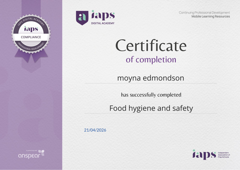 Awarded for completing the Food hygiene and safety CPD course from the IAPS Digital Academy.