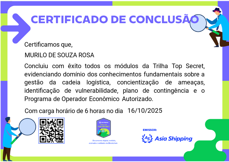 Esta badge certifica a conclusão da Trilha Top Secret. O participante demonstrou domínio sobre conceitos de Gestão da Cadeia Logística, conscientização de ameaças, identificação de vulnerabilidades, plano de Contingência e Programa de Operador Econômico Autorizado.