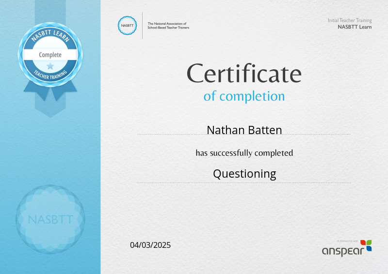 Completed the NASBTT Learn module Questioning. 1 hour of self-directed learning.