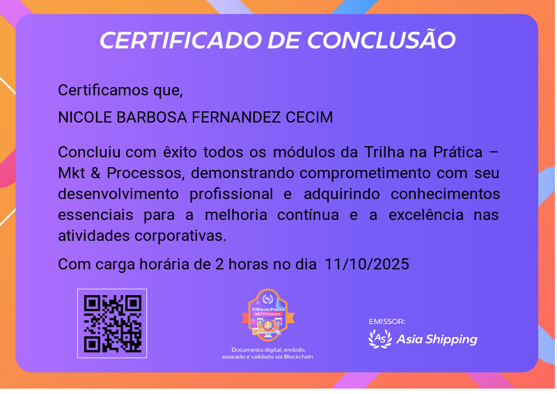 Certifica a conclusão da Trilha na Prática – Mkt & Processos, referente as campanhas de marketing e otimização de processos internos.