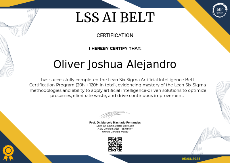 The Lean Six Sigma Artificial Intelligence Belt is a specialized certification that integrates the core principles of Lean Six Sigma with the cutting-edge capabilities of artificial intelligence. This certification equips professionals with the tools to analyze data, optimize processes, and eliminate waste more effectively through AI-driven insights. By blending statistical methodologies with machine learning and automation, individuals holding this certification can drive continuous improvement, enhance operational efficiency, and deliver measurable results in complex environments, leveraging technology to solve problems faster and with greater precision.