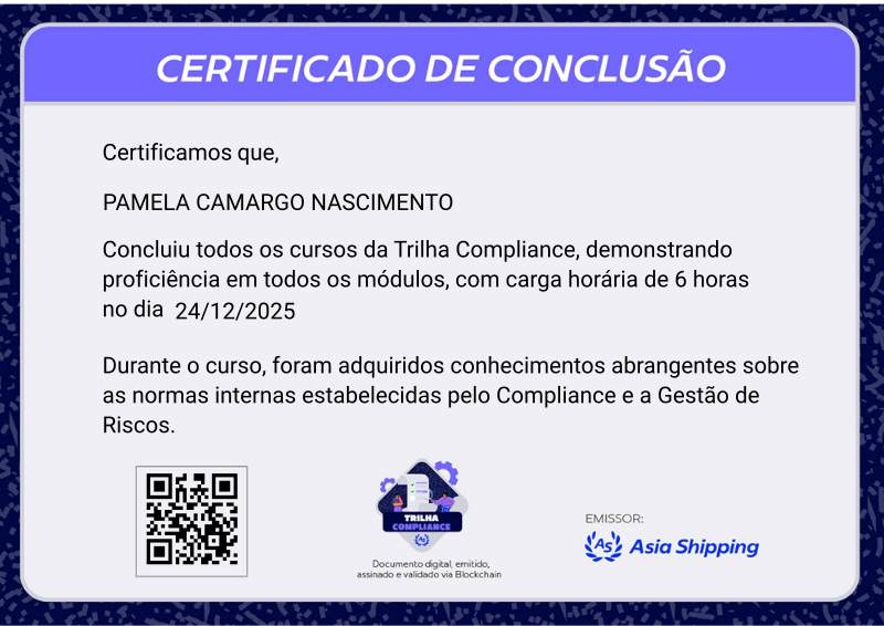 A Trilha Compliance é mais uma Badge do programa de certificação da Asia Shipping. Com ela você terá a oportunidade de conhecer mas sobre Compliance na Asia Shipping, como também Gestão de Riscos, suas principais definições e etapas de identificação.