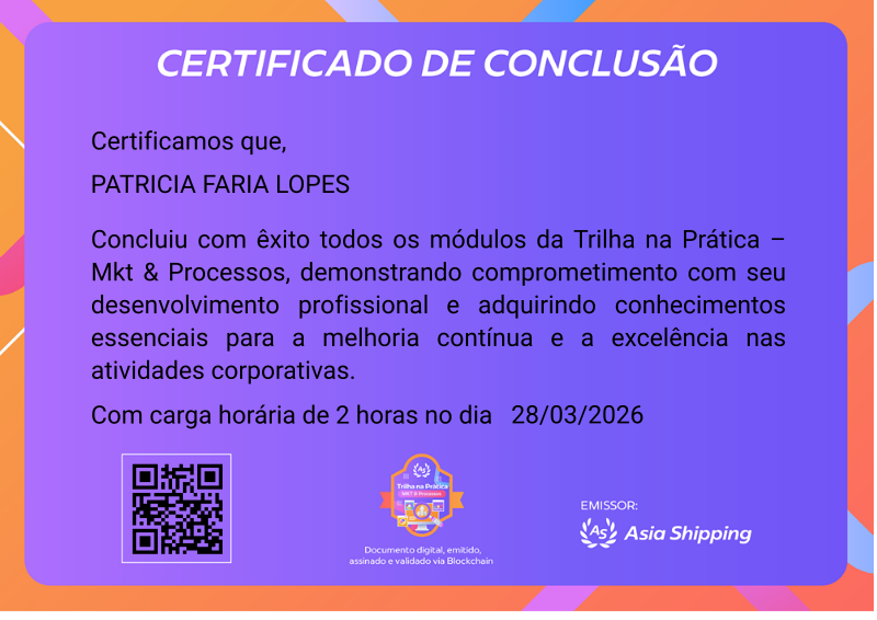 Certifica a conclusão da Trilha na Prática – Mkt & Processos, referente as campanhas de marketing e otimização de processos internos.