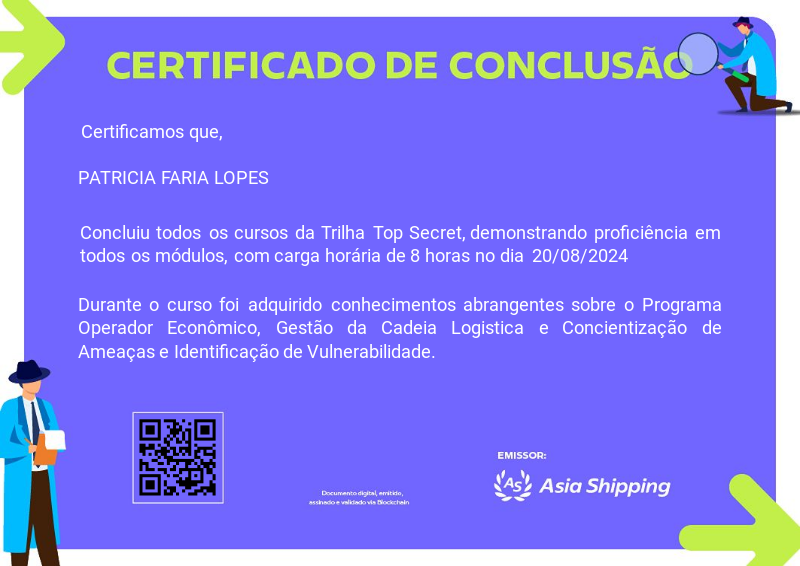 A Trilha Top Secret é mais um badge do programa de certificação da Asia Shipping. Nela você terá a oportunidade de conhecer fatos importantes sobre toda nossa Gestão da Cadeia Logística, além de informações mais aprofundadas sobre conscientização de Ameaça e Identificação de vulnerabilidades e o Programa de Operador Econômico Autorizado, aplicados em nossa companhia.