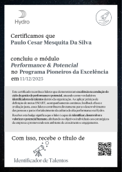 Esta badge reconhece líderes que demonstraram excelência na condução do ciclo de gestão de performance e potencial, atuando como verdadeiros identificadores de talentos dentro da organização. Ao aplicar práticas de definição de metas SMART, acompanhamento contínuo, feedback eficaz e avaliação justa, esses líderes contribuem diretamente para o desenvolvimento das pessoas e para o fortalecimento da cultura de alta performance na Hydro.