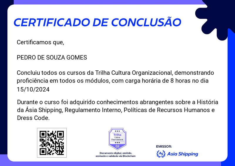 A Trilha Cultura Organizacional é mais um badge do programa de certificação da Ásia Shipping. Nela você terá a oportunidade de conhecer sobre a História da Ásia Shipping, além do Regulamento Interno, Políticas de Recursos Humanos e orientações de Dress Code.