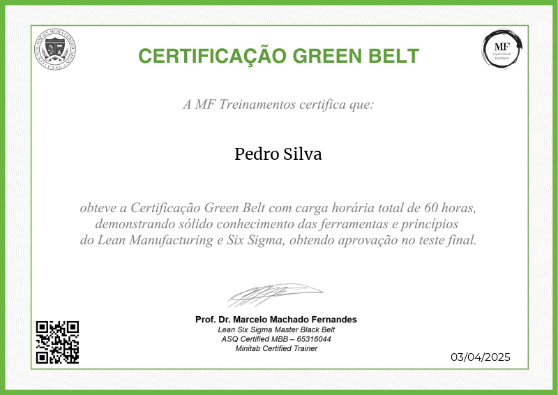 Explorando os princípios do Lean Six Sigma, a certificação Green Belt fornecida pela MF OPEX, sob a orientação do Professor Marcelo Fernandes, representa um avanço significativo no treinamento de excelência operacional. Com um currículo abrangente que mescla teorias avançadas com aplicação prática, os participantes aprofundam sua compreensão em otimização de processos, análise avançada de dados e liderança de projetos. Além disso, os Green Belts estão capacitados para liderar projetos Lean Six Sigma, guiando equipes por iniciativas complexas com confiança e expertise. A orientação estimada do Professor Fernandes enriquece o programa com metodologias de ponta, capacitando os aprendizes a impulsionar melhorias substanciais dentro de suas organizações. Servindo como um marco crucial no desenvolvimento profissional, esta certificação não apenas qualifica indivíduos para liderar projetos em maior escala, mas também incute a confiança e competências necessárias para promover mudanças transformadoras em diversos cenários da indústria.