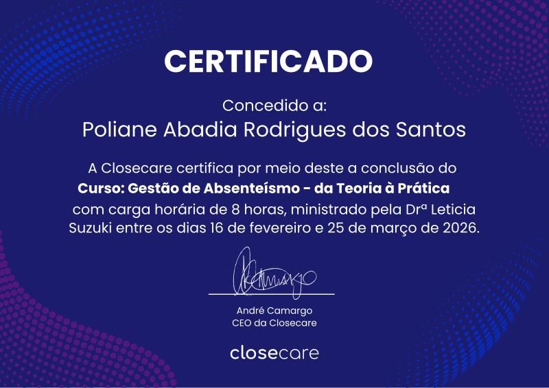 O curso de Gestão de Absenteísmo: da Teoria à Prática aconteceu entre os dias 16 de fevereiro e 25 de março. As aulas foram ministradas pela Drª Leticia Suzuki (https://www.linkedin.com/in/leticia-cristina-suzuki-621585131/). O curso foi composto por oito aulas que abordaram os seguintes tópicos: