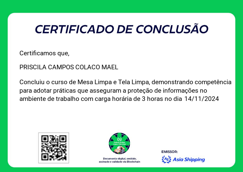 O badge de treinamento de Mesa Limpa e Tela Limpa da Asia Shipping capacita os colaboradores a manterem o ambiente de trabalho organizado e seguro, reduzindo o risco de exposição de informações confidenciais e fortalecendo a cultura de segurança da Informação na empresa.