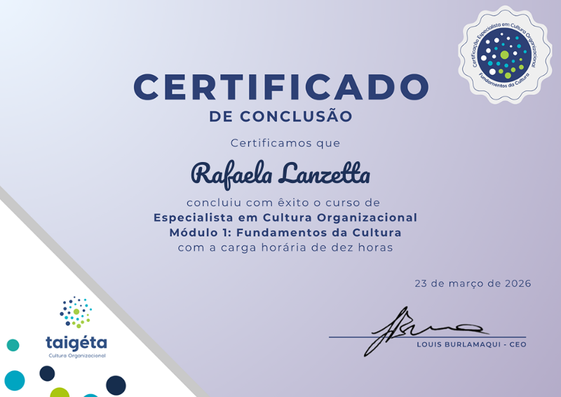 Para ganhar esta medalha e certificado, o aluno concluiu a carga horária do módulo 1 Fundamentos da Cultura Organizacional e entregou seu trabalho de conclusão de módulo com nota satisfatória.