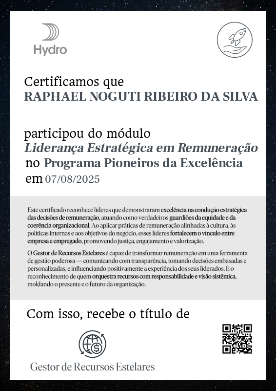 ✅ Participar integralmente do módulo Liderança Estratégica em Remuneração no programa Pioneiros da Excelência, demonstrando presença ativa nas discussões e atividades.