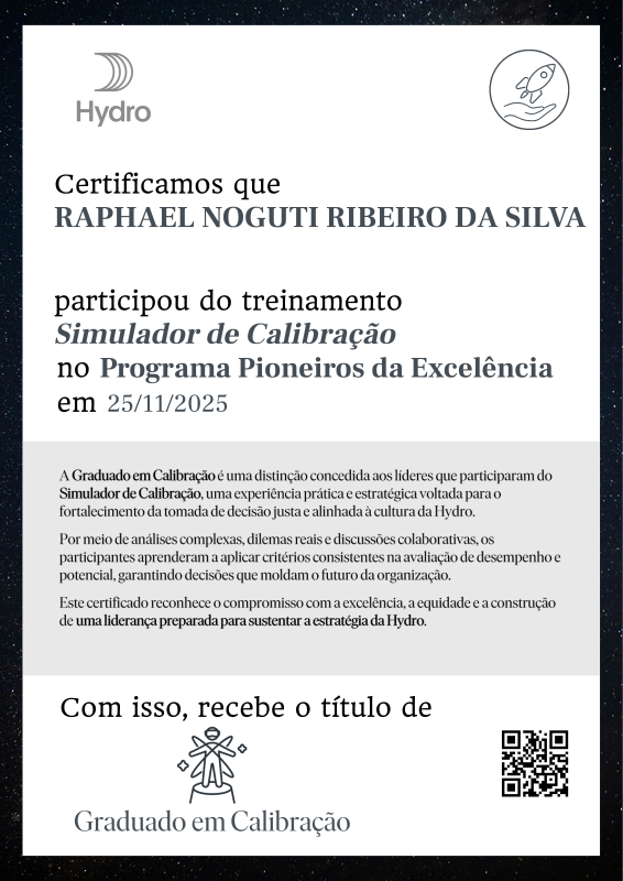 A Graduado em Calibração é uma distinção concedida aos líderes que participaram do Simulador de Calibração, uma experiência prática e estratégica voltada para o fortalecimento da tomada de decisão justa e alinhada à cultura da Hydro.