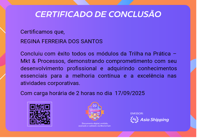 Certifica a conclusão da Trilha na Prática – Mkt & Processos, referente as campanhas de marketing e otimização de processos internos.