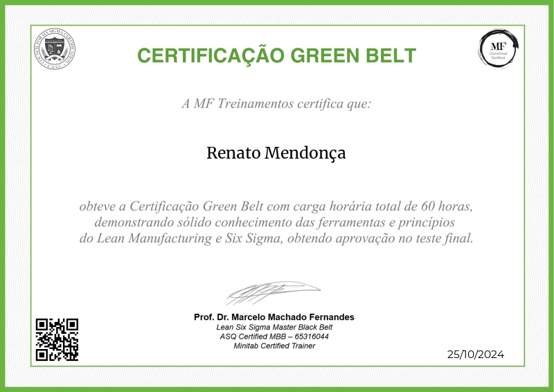 Explorando os princípios do Lean Six Sigma, a certificação Green Belt fornecida pela MF OPEX, sob a orientação do Professor Marcelo Fernandes, representa um avanço significativo no treinamento de excelência operacional. Com um currículo abrangente que mescla teorias avançadas com aplicação prática, os participantes aprofundam sua compreensão em otimização de processos, análise avançada de dados e liderança de projetos. Além disso, os Green Belts estão capacitados para liderar projetos Lean Six Sigma, guiando equipes por iniciativas complexas com confiança e expertise. A orientação estimada do Professor Fernandes enriquece o programa com metodologias de ponta, capacitando os aprendizes a impulsionar melhorias substanciais dentro de suas organizações. Servindo como um marco crucial no desenvolvimento profissional, esta certificação não apenas qualifica indivíduos para liderar projetos em maior escala, mas também incute a confiança e competências necessárias para promover mudanças transformadoras em diversos cenários da indústria.