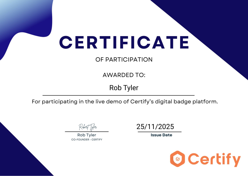 This badge recognises successful completion of a guided demonstration of the Certify digital credential platform. Earners explored how to create, issue and manage branded digital badges and certificates, and learned how credential analytics support visibility, skills recognition and learner engagement.