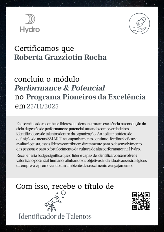 Esta badge reconhece líderes que demonstraram excelência na condução do ciclo de gestão de performance e potencial, atuando como verdadeiros identificadores de talentos dentro da organização. Ao aplicar práticas de definição de metas SMART, acompanhamento contínuo, feedback eficaz e avaliação justa, esses líderes contribuem diretamente para o desenvolvimento das pessoas e para o fortalecimento da cultura de alta performance na Hydro.