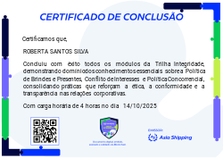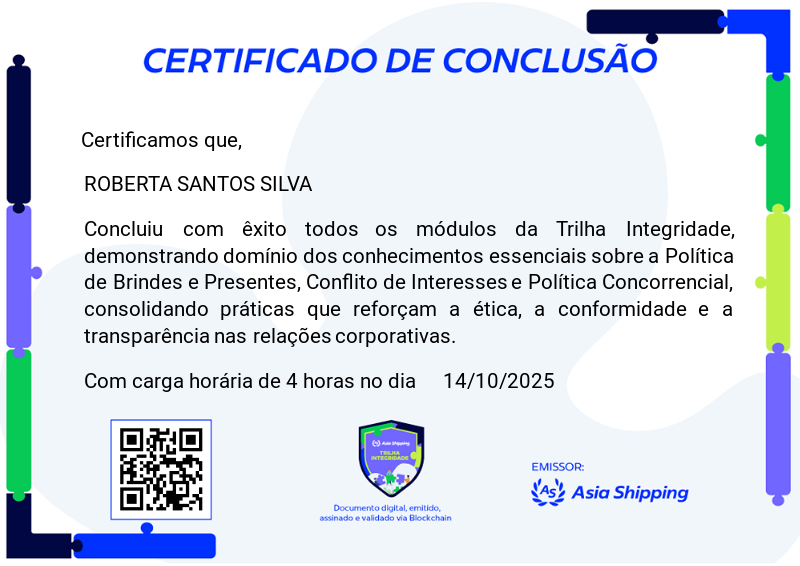 Esta badge certifica a conclusão da trilha de Integridade. O participante demonstrou domínio dos conhecimentos essenciais sobre a Política de Brindes e Presentes, Conflito de Interesses e Política Concorrencial, consolidando práticas que reforçam a ética, a conformidade e a transparência nas relações corporativas. Esses pilares são fundamentais para a integridade, a reputação e o sucesso da organização.