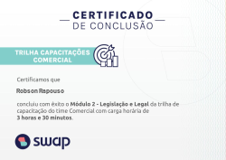 Objetivo: A trilha foi criada exclusivamente para o time Comercial da Swap com o objetivo de mitigar erros de venda no curto prazo e redução do ciclo de vendas no longo prazo. O segundo módulo tem o objetivo de amplicar os conhecimentos sobre os conceitos de IP e IF, além de entender o impacto da legislação em nosso negócio e o fluxo de solicitação e negociação de contratos com nossos clientes.