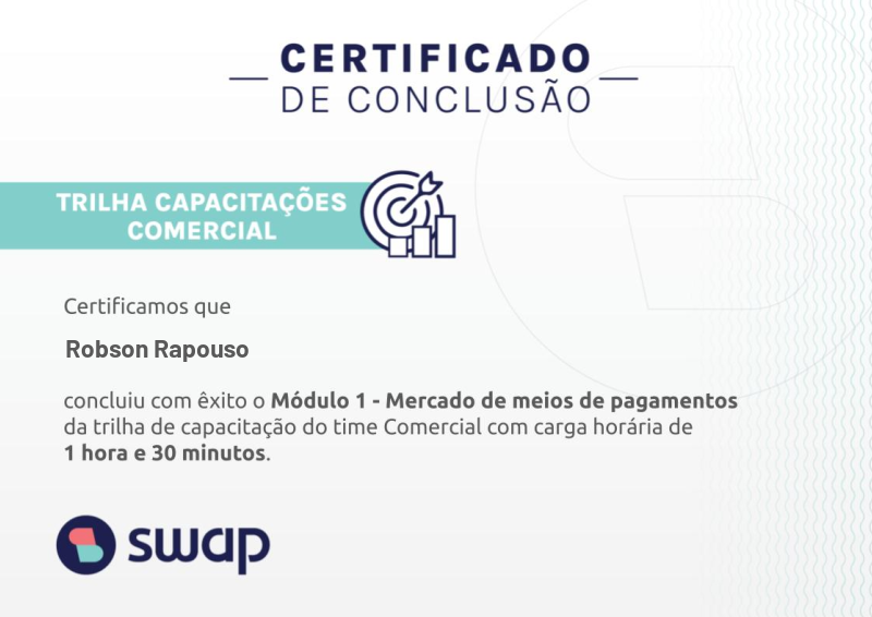 Objetivo: A trilha foi criada exclusivamente para o time Comercial da Swap com o objetivo de mitigar erros de venda no curto prazo e redução do ciclo de vendas no longo prazo. O primeiro módulo aborda o Mercado de Meios de pagamentos para dar o contexto aos participantes sobre como este mercado foi construído no contexto internacional e nacional, além de conceitualizar alguns termos importantes do ramo.