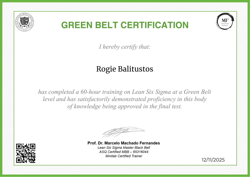 Exploring the principles of Lean Six Sigma, the Green Belt certification offered by MF OPEX, under the mentorship of Professor Marcelo Fernandes, represents a pivotal step forward in operational excellence training. Equipped with an extensive curriculum blending advanced theories with hands-on application, participants not only deepen their understanding of process optimization, advanced data analysis, and project leadership but also become adept at spearheading Lean Six Sigma projects. Professor Fernandes' esteemed guidance enriches the program with cutting-edge methodologies, empowering learners to drive substantial improvements within their organizations. Serving as a significant milestone in professional development, this certification not only qualifies individuals to lead larger-scale projects but also instills the confidence and expertise needed to enact transformative change across diverse industry landscapes.