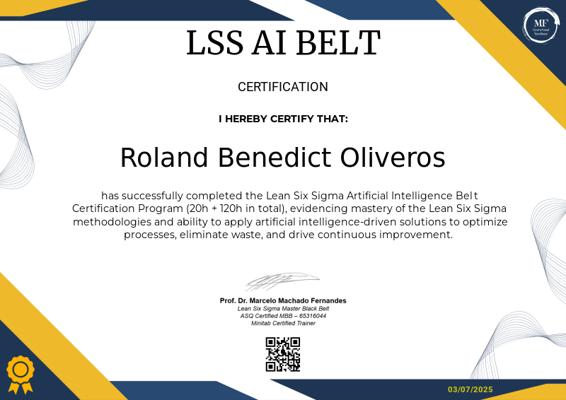 The Lean Six Sigma Artificial Intelligence Belt is a specialized certification that integrates the core principles of Lean Six Sigma with the cutting-edge capabilities of artificial intelligence. This certification equips professionals with the tools to analyze data, optimize processes, and eliminate waste more effectively through AI-driven insights. By blending statistical methodologies with machine learning and automation, individuals holding this certification can drive continuous improvement, enhance operational efficiency, and deliver measurable results in complex environments, leveraging technology to solve problems faster and with greater precision.