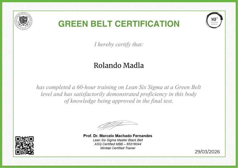 Exploring the principles of Lean Six Sigma, the Green Belt certification offered by MF OPEX, under the mentorship of Professor Marcelo Fernandes, represents a pivotal step forward in operational excellence training. Equipped with an extensive curriculum blending advanced theories with hands-on application, participants not only deepen their understanding of process optimization, advanced data analysis, and project leadership but also become adept at spearheading Lean Six Sigma projects. Professor Fernandes' esteemed guidance enriches the program with cutting-edge methodologies, empowering learners to drive substantial improvements within their organizations. Serving as a significant milestone in professional development, this certification not only qualifies individuals to lead larger-scale projects but also instills the confidence and expertise needed to enact transformative change across diverse industry landscapes.