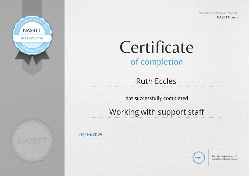 This module celebrated the roles of teaching and learning assistants, and other support staff in schools who are invaluable to ensuring good outcomes for pupils. Mentors learned to support their mentees in collaboration with these teams in order to ensure teaching and learning outcomes are met by all.