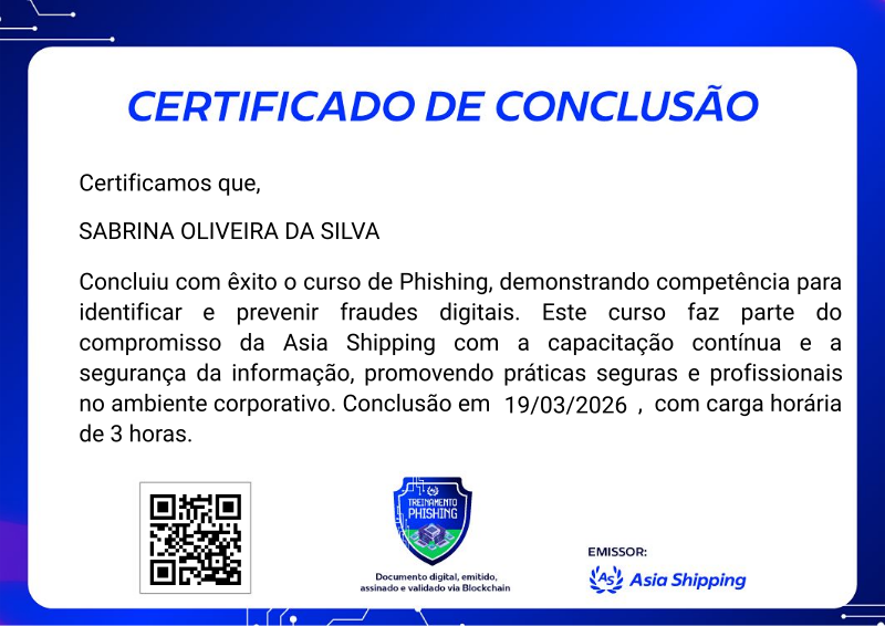 O badge de treinamento em Phishing faz parte do programa de certificação da Asia Shipping e capacita os participantes a reconhecer e evitar tentativas de fraude digital. Com foco em práticas seguras de comunicação e proteção de dados no ambiente corporativo, o treinamento prepara os colaboradores para identificar ameaças e fortalecer a segurança da informação na empresa.