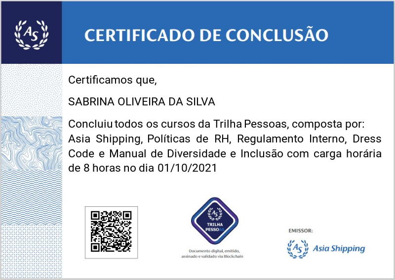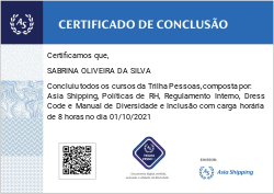 A Trilha PessoAS é mais uma badge do programa de certificação da Asia Shipping. Nela você terá a oportunidade de conhecer fatos importantes sobre a trajetória da Asia Shipping no mercado, além de informações mais aprofundadas sobre as políticas de Recursos Humanos, Regulamento Interno, Dress code e Manual de Diversidade e Inclusão, aplicados em nossa companhia.