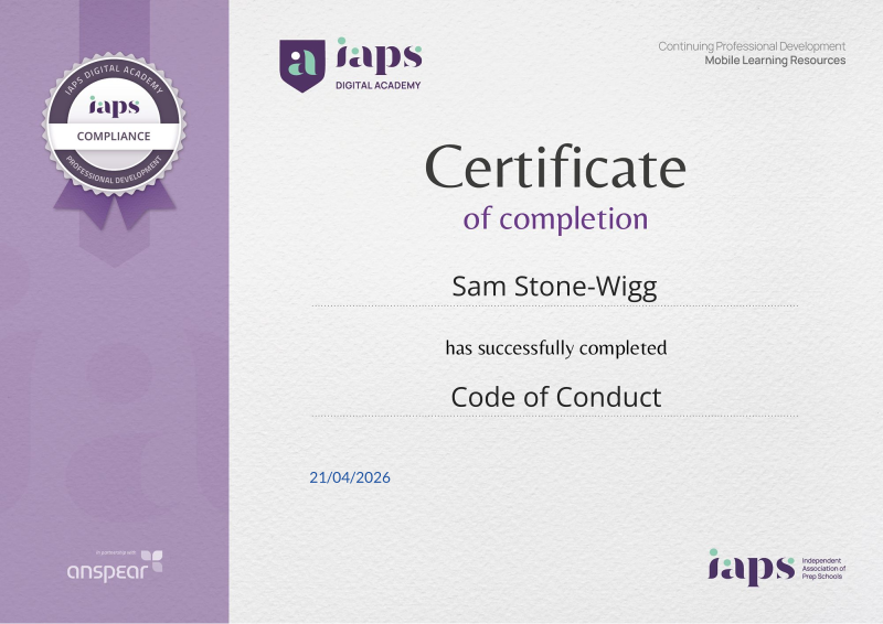 Awarded for completing the Code of Conduct CPD course from the IAPS Digital Academy.