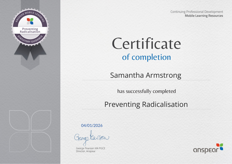Awarded for completing the Preventing Radicalisation CPD course from Anspear.