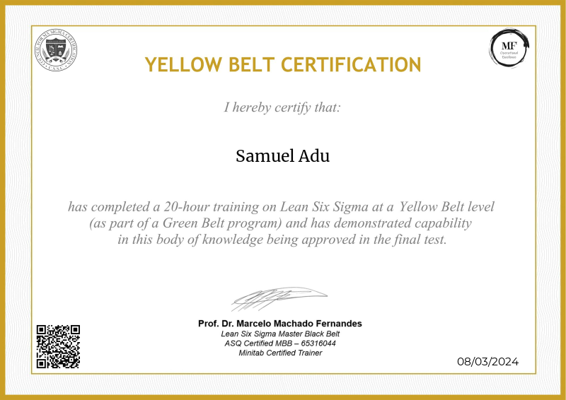 Delving into the intermediate principles of Lean Six Sigma, the Yellow Belt certification provided by MF OPEX, guided by Professor Marcelo Fernandes, marks a significant progression in operational excellence training. Through a meticulously structured curriculum blending advanced theories with practical application, participants deepen their understanding of process optimization, advanced data analysis, and project leadership. Professor Fernandes' renowned expertise enriches the program with cutting-edge methodologies, empowering learners to spearhead impactful improvements within their organizations. Serving as a pivotal milestone in professional development, this certification not only opens doors to larger-scale projects but also fosters the confidence and skills needed to drive transformative change across diverse industry landscapes.