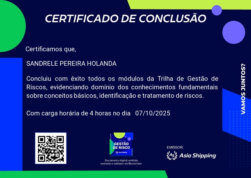 Esta badge certifica a conclusão da Trilha de Gestão de Riscos. O participante demonstrou domínio dos conhecimentos essenciais sobre a conceitos básicos, identificação e tratamento de riscos.
