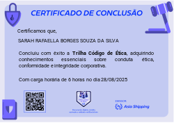 Este badge certifica a conclusão da Trilha Código de Ética. Atesta conhecimento em conduta íntegra, conformidade legal (LGPD, SGSI), anticorrupção e processos de investigação interna, essenciais para a organização.