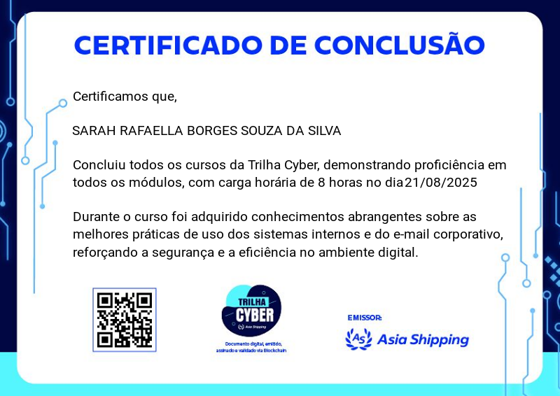 A Trilha Cyber é um dos badges do programa de certificação da Asia Shipping. Ela aborda as melhores práticas de uso dos sistemas internos e do e-mail corporativo, reforçando a segurança e a eficiência no ambiente digital.
