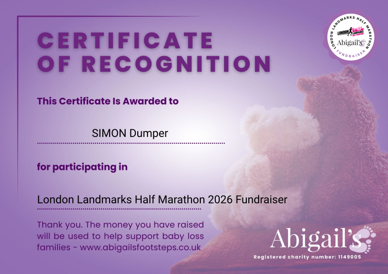 This certificate and badge is awarded in recognition of taking part in the London Landmarks Half Marathon, as part of Abigail’s Footsteps’ largest fundraising event of the year.