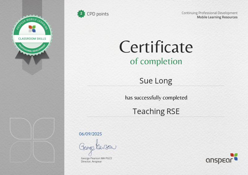 Awarded for completing the Teaching RSE CPD course from Anspear.