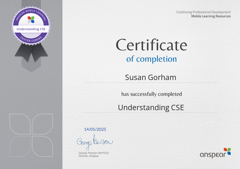 Awarded for completing the Understanding CSE CPD course from Anspear.