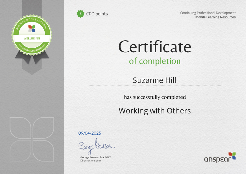 Awarded for completing the Working with Others CPD course from Anspear.