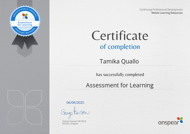 Awarded for completing the Assessment for Learning CPD course from Anspear.